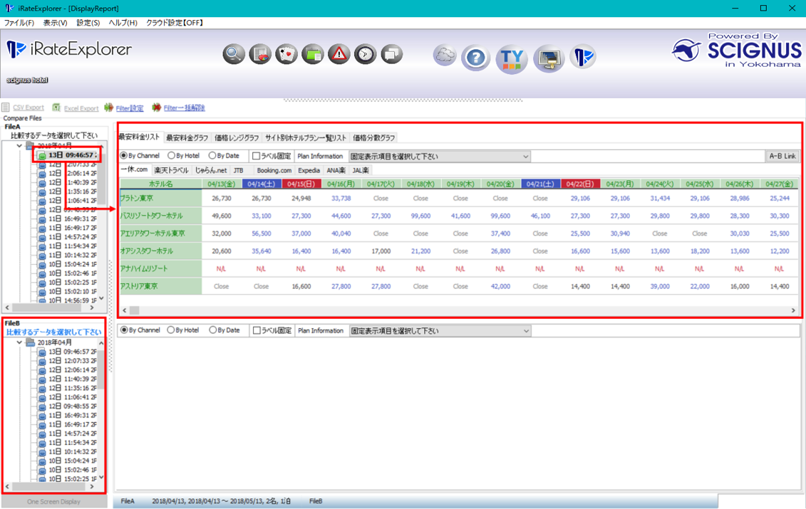 初めに上側のエクスプロールバーから、比較表示する1つ目のファイルを選択して下さい。このファイルが比較元ファイル(=基本データファイル:以降[File A]と呼びます)となります。