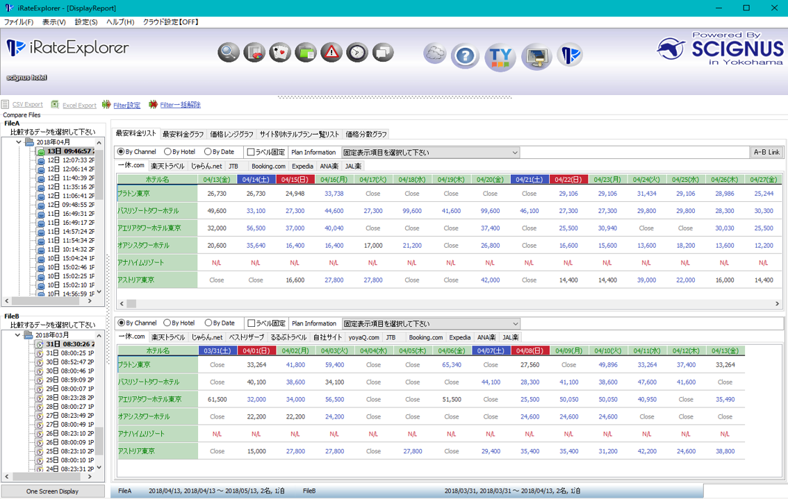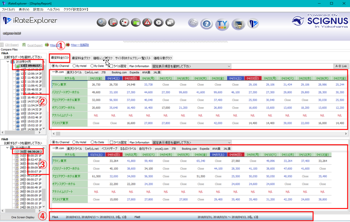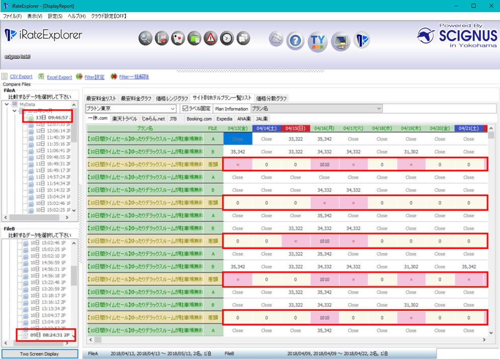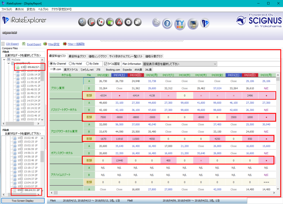 サイト別ホテルプラン一覧リストの表示サンプル (差額欄の表示内容の説明はこちら)