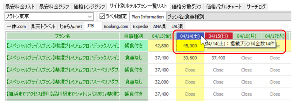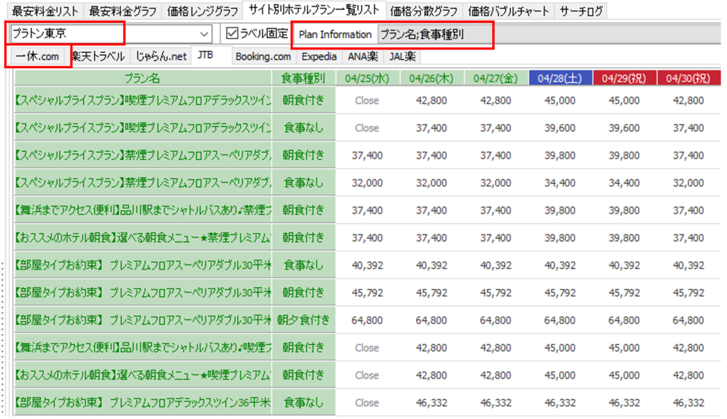 上例は、検索を行った期間中に「プラトン東京」が「一休.com」にて販売している全ての料金(プラン)を表示しています。(「プラン名」「食事種別」を固定表示させている状態です。)![]()