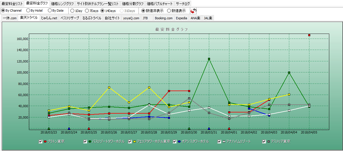 最安料金グラフは表示オプションの変更にて「By Channel」、「By Hotel」、「By Date」の変更が可能です。