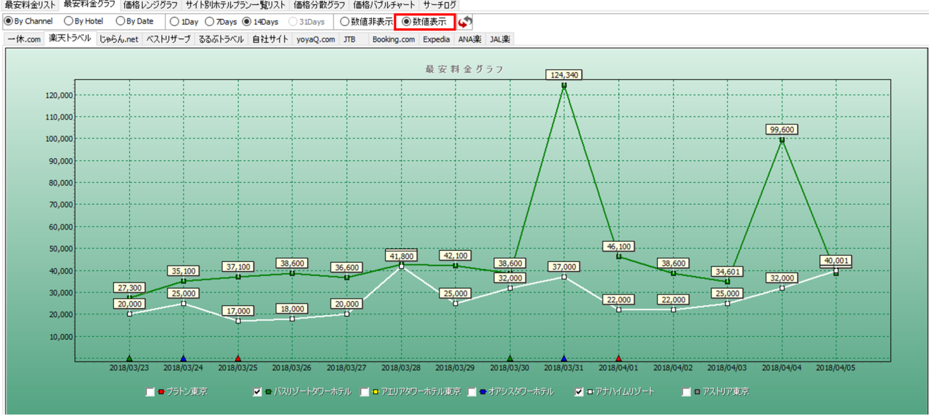 上図は、凡例のチェックボックスを使ってグラフ上のホテルを2つに絞り、且つ、数値表示のオプションを選択した状態のグラフです。![]()