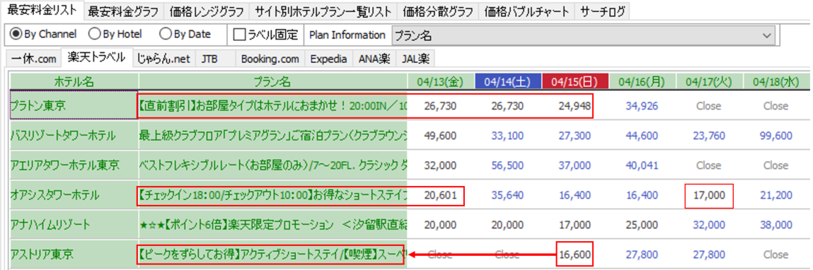 各ホテルにおける「最安料金」は、常時、同じプランが最も安い料金として販売されているわけではありません。その為、iRateExplorer はユーザーに代わって「同じプラン内容で料金が変化しているのか?」または「該当日において最も安いプランではあるが、内容の違うプランなのか?」を自動的に識別してリスト上に表示します。