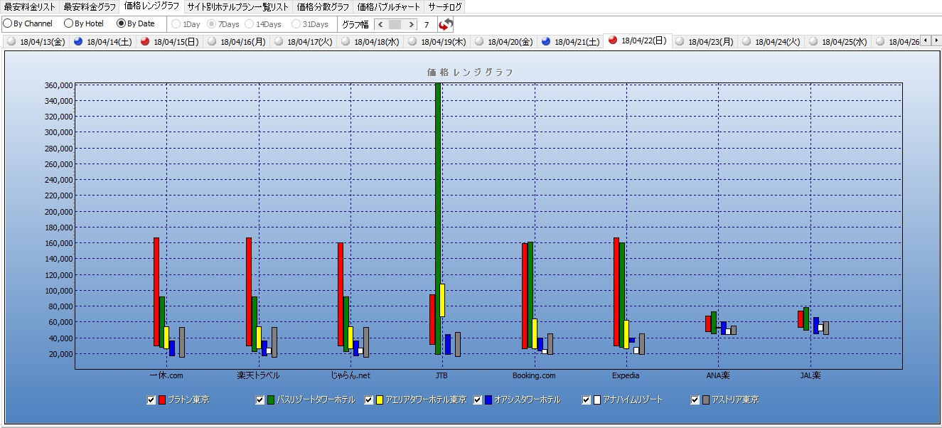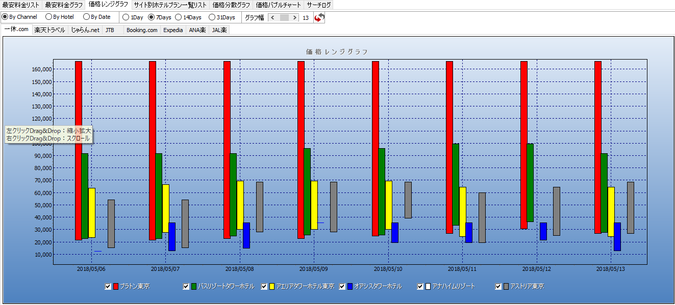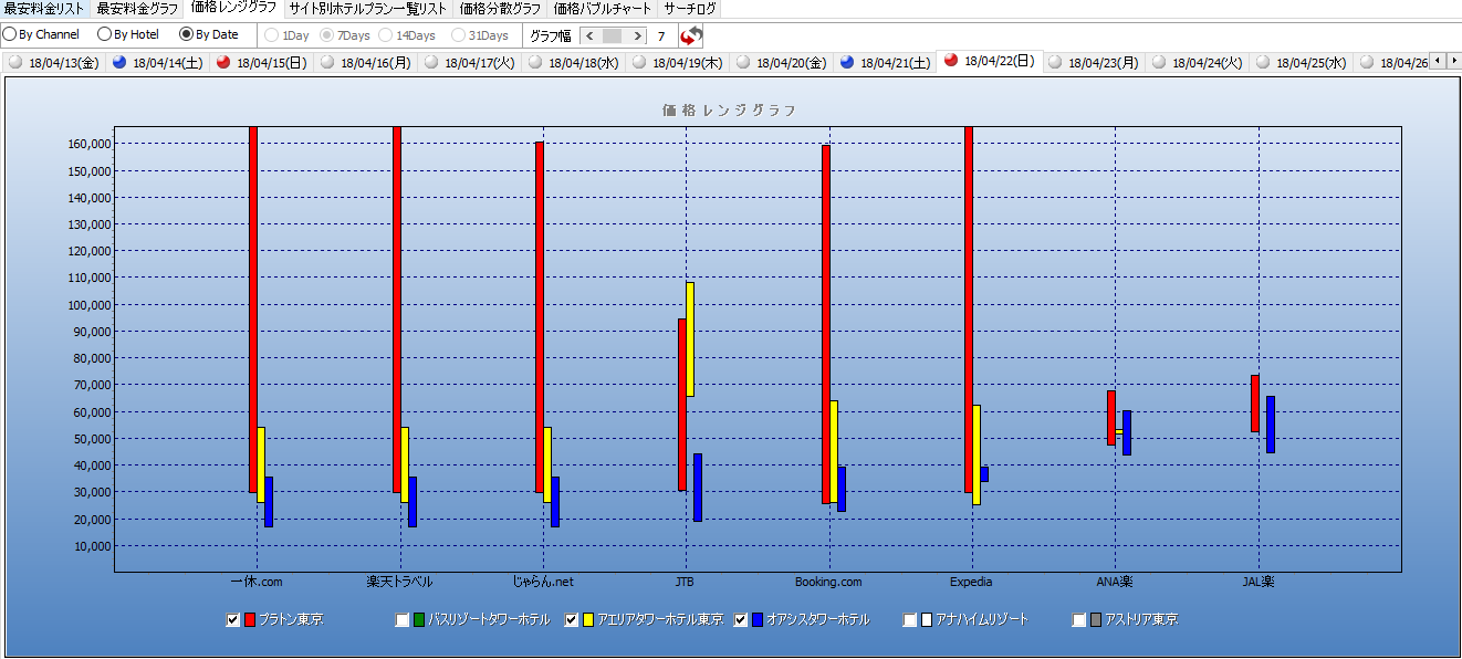 価格レンジグラフは表示オプションの変更にて「By Channel」、「By Hotel」、「By Date」の変更が可能です。![]()