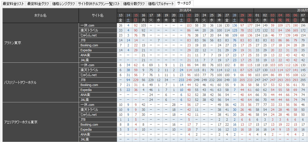 また、「-」は当該サイトに当該ホテルの掲載(登録)がないか、掲載(登録)されていても該当日にプランが何も販売されていない(=クローズ)事を表します。