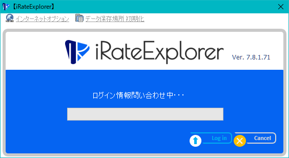 [Login]ボタンをクリックすると iRateExplorer プログラムはサーバーと通信を行い、ユーザー認証を行うと共に、サーバー上に設定されたマスター情報に従って必要な設定を自動的に行います。サーバーとの通信中には以下のようなメッセージが表示されます。