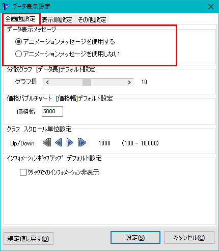 ご使用のPCによっては、リストやグラフ生成中を表すアニメーションを表示することで、生成速度が遅くなる現象が確認されています。もし、このような現象が発生する場合には、「データ表示メッセージ」で「アニメーションメッセージを使用しない」を選択し、[設定]ボタンをクリックして下さい。