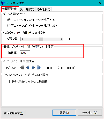 価格バブルチャートで表示される、グラフの価格幅の初期設定値を変更する。