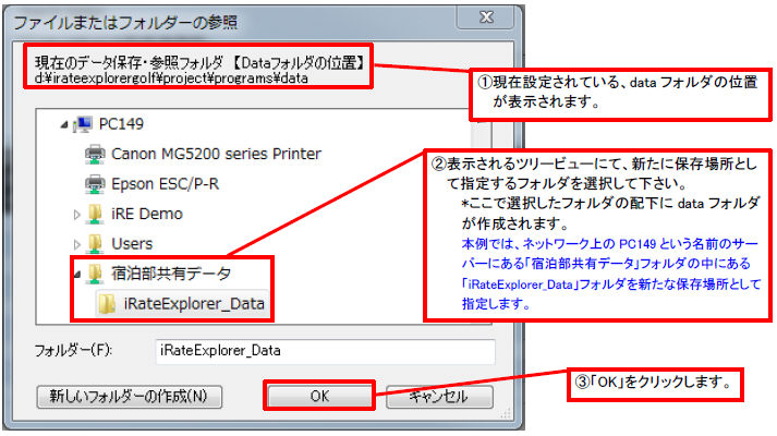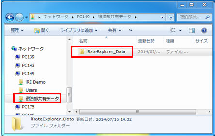 ここでは、PC149というネットワーク上のPC(サーバー)の「宿泊部共有データ」というフォルダ内に「iRateExplorer_Data」というフォルダを新たに作成し、その中にデータ保存場所(「data」フォルダ)を変更することを例にご説明を進めてまいります。