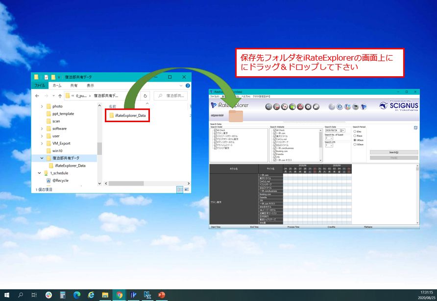 A-1 下図のように「iRateExplorer画面」と「ステップ1で作成したiRateExplorer_Dataフォルダ」が両方と もデスクトップに表示されるよう、画面を調整して下さい。