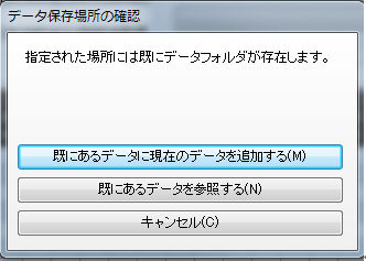新たなデータ保存場所として指定するフォルダに巡回データが存在する場合には、続けて、次のような画面が表示されます。この画面では、全てのデータを統合するのか?変更先のデータを参照するのか?が選択可能です。
