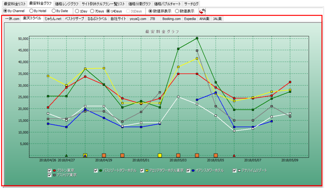 機能・画面説明 機能と画面 06 レポート・グラフウィンドウ 【Display Report】画面のレポートタブによって選択されたレポートやグラフは、このウィンドウに表示されます。 レポート・グラフウィンドウでは、表示されるレポートやグラフの内容に応じて「表示オプション」が切り替ります。表示オプションの例各表示オプションについてはレポートの説明を参照して下さい。