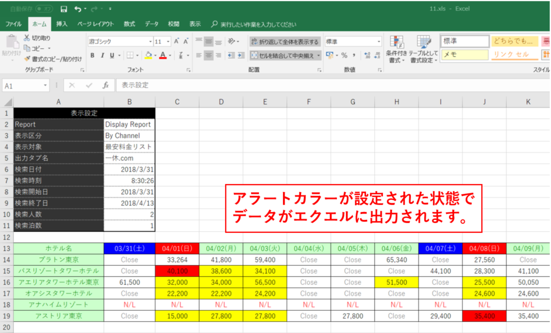 - また、[Excel Export]アイコンをクリックするとアラートカラーを反映したままデータをエクセルに出力します。