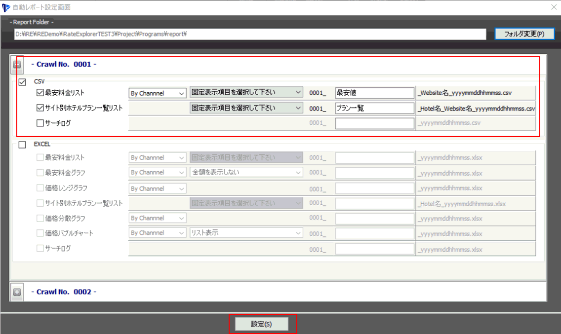 その後、出力レポートの設定をします。レポートはCrawl No毎に指定が可能です。