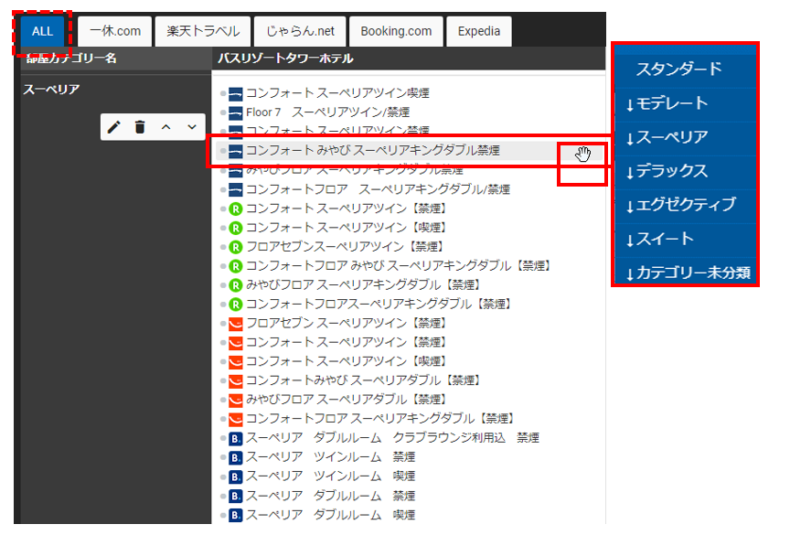- 移動させたい部屋カテゴリー名の上にカーソルを置き、1クリックすると、該当の部屋タイプが移動します。