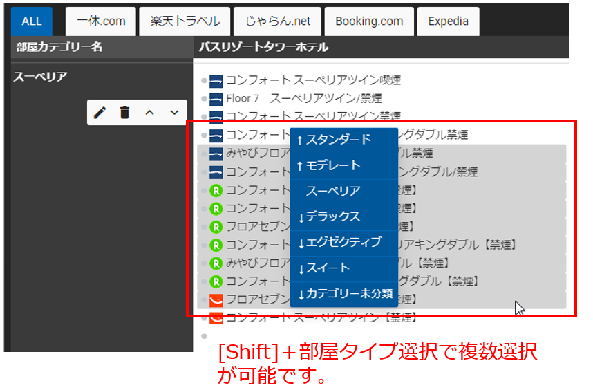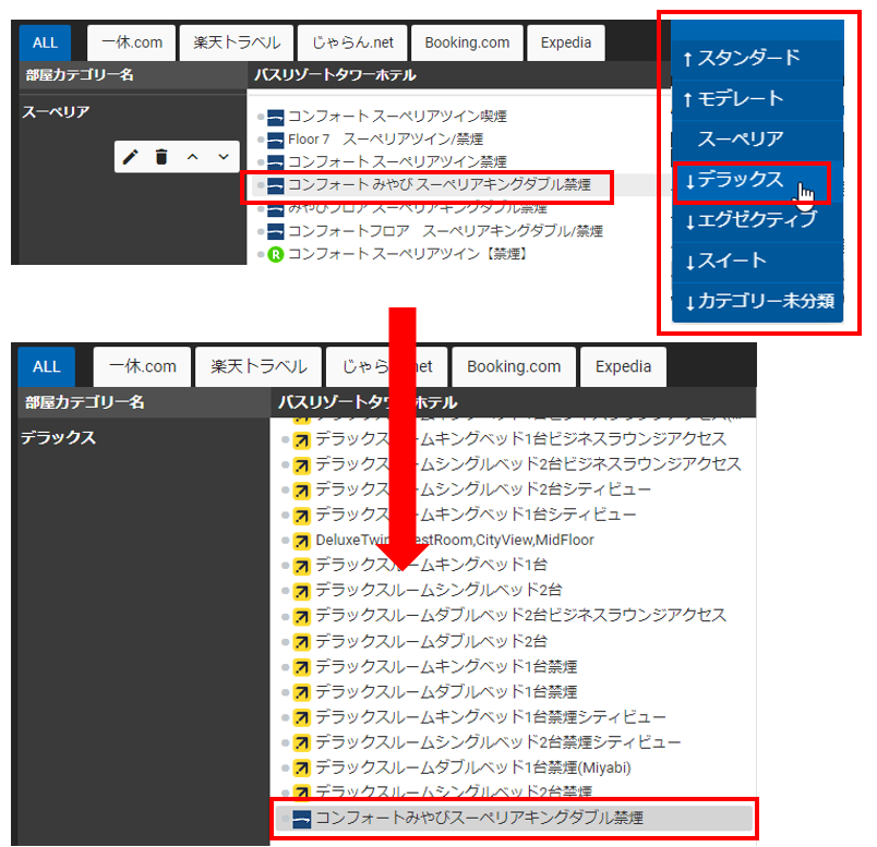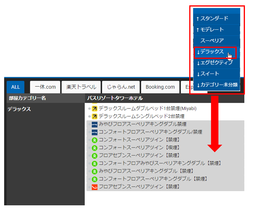 バスリゾートタワーホテルの各チャネルに登録されている部屋タイプの中で、初期値では、スーペリアに登録されている部屋タイプをデラックスへ移動させていきます。