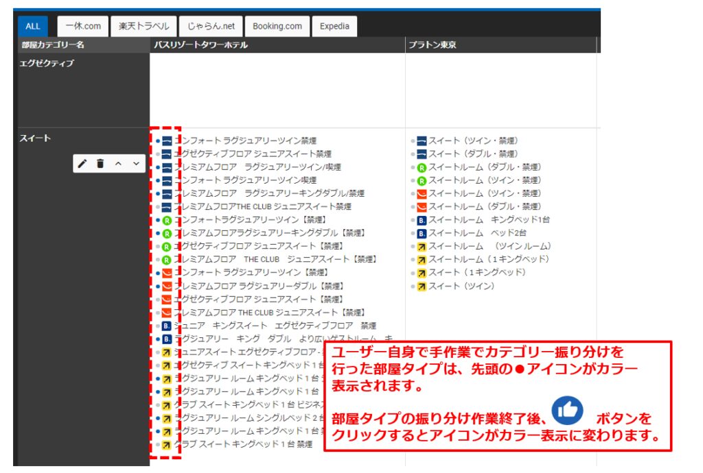 ユーザー側で手動で振り分け登録した部屋タイプについては、各部屋タイプ名の冒頭にマーカー表記をしています。