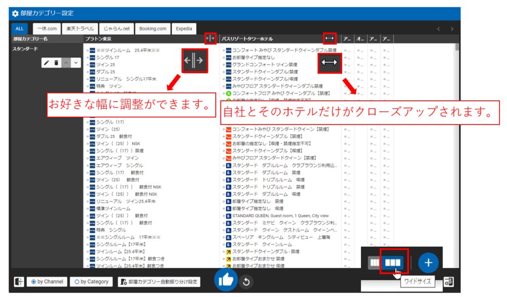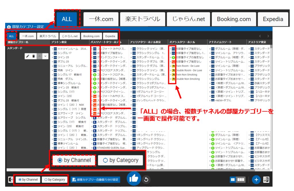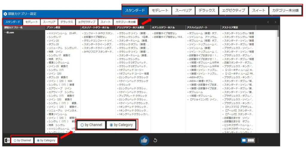 チャネル別に部屋カテゴリーの内容を確認できます。
