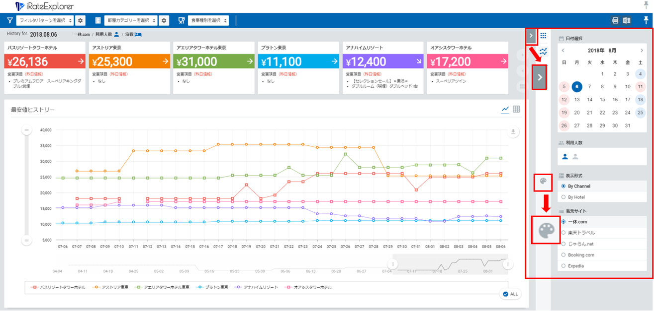 By Channel:選択したサイトに掲載された各ホテルの料金を表示します。