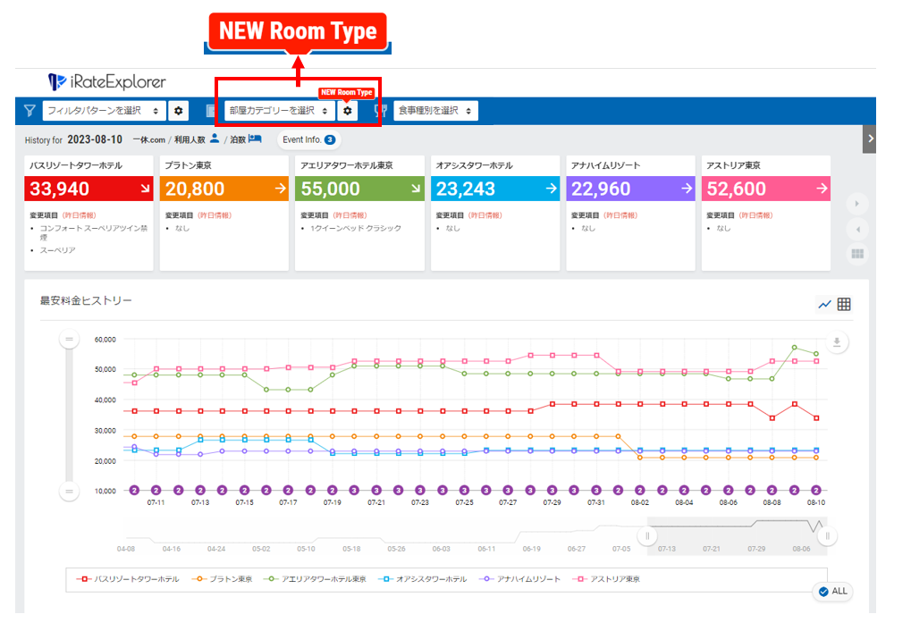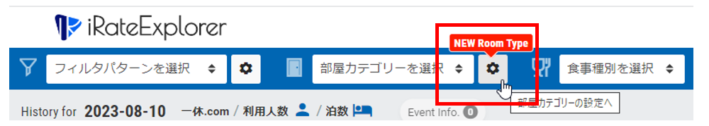 「NEW Room Type」アイコンが表示されている場合、ご自身のホテルまたは競合ホテルで新規部屋タイプが見つかったことをお知らせしておりますので、「部屋カテゴリー設定」アイコンをクリックして、設定画面にお進みください。