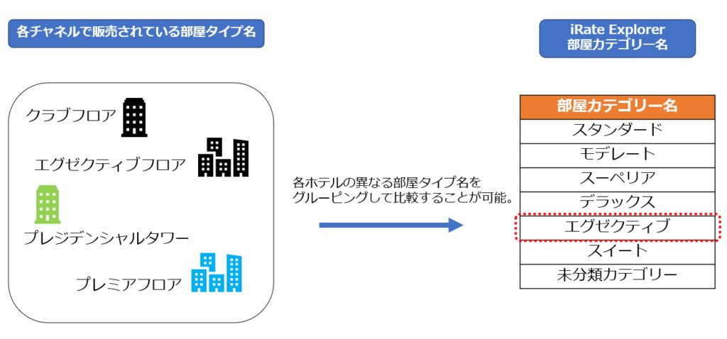 各ホテルの部屋タイプを同じ部屋カテゴリーにグルーピングすることで、比較することが可能です。