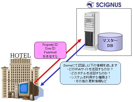 環境設定 ホテルマスターの役割 サイグナス社のサーバー上には各ホテル、各ユーザーごとのマスター情報が登録されています。 各ホテルに設置された iRateExplorer は起動後にユーザーがログインを行う事でサイグナス社のサーバーと通信を行い、ユーザー認証に続いてさまざまな設定情報を読込みます。 ■ログイン時に読込まれる情報■・ユーザー権限・巡回するWebサイト・巡回するホテル・ユーザーが使用しているプログラムのバージョン情報(必要に応じて自動更新)・その他、iRateExplorerに必要な最新の設定情報