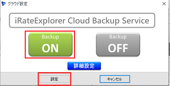 ナビゲーションバーの「Cloud」アイコンをクリックし、表示された設定画面で[Backup]を[ON]にし、[設定]ボタンをクリックして下さい。