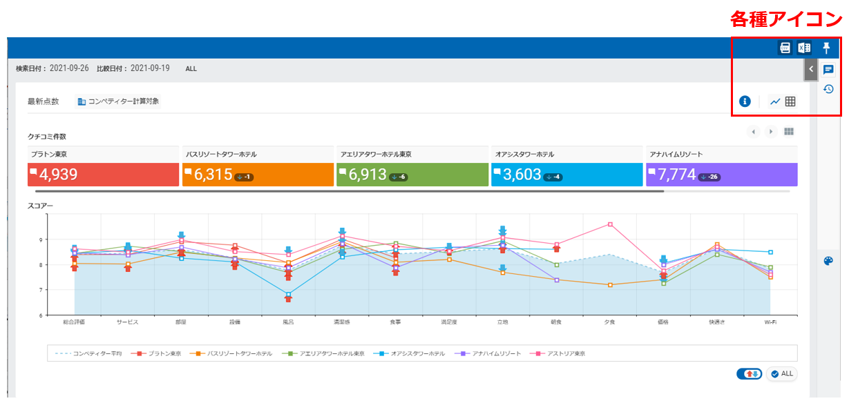 - お使いのブラウザでクチコミレポート画面が表示されますので、画面右側のアイコンにて操作を行います。